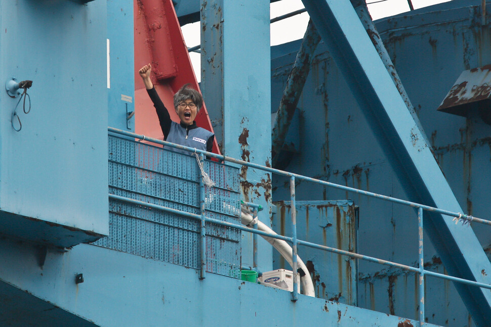 김진숙 지도위원이 2011년 6월 부산 한진중공업 영도조선소 85호 크레인에서 고공농성을 하고 있다. 박승화 <한겨레21> 기자 eyeshoot@hani.co.kr